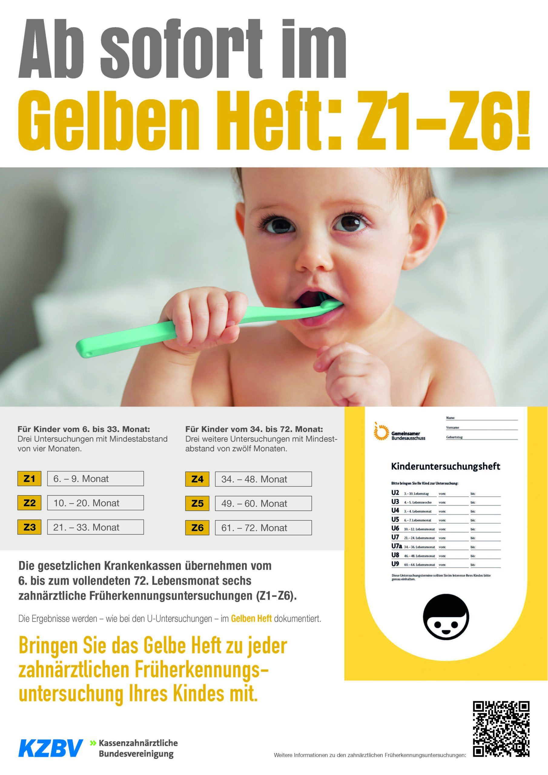 Ab Januar 2026 werden die Ergebnisse der zahnärztlichen Früherkennungsuntersuchungen (Z1–Z6) im „Gelben Heft“ (U-Heft) dokumentiert.